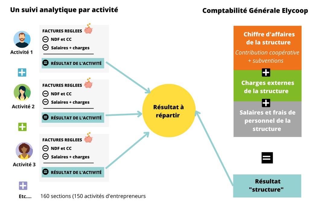 Le cadre légal et comptable indique qu'une CAE, comme Elycoop, est constituée d'une comptabilité générale car elle représente une entreprise avec un seul numéro SIRET.