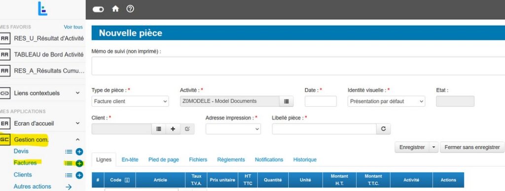 Option 1 : Je dois facturer une prestation de services, une vente avec TVA et / ou de la formation professionnelle exclusivement en sous-traitance (en faisant partie des membres de l'OF en sous-traitance exclusive) Je dois créer la facture sur Louty. Depuis le formulaire "Gestion com" - je sélectionne "Facture" ou si j'ai déjà saisi une ou plusieurs factures - "duplication". Cela signifie qu'une pièce identique à la précédente peut être créée et peut être entièrement modifiée.