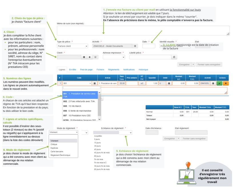 En général, sur le module de facturation Louty, la tva est paramétrée à 20 % pour les prestations de services, les ventes de marchandises…mais attention, si je facture un professionnel ou un particulier dans l'Union Européenne, hors Union Européenne ou dans les Dom-Tom.
