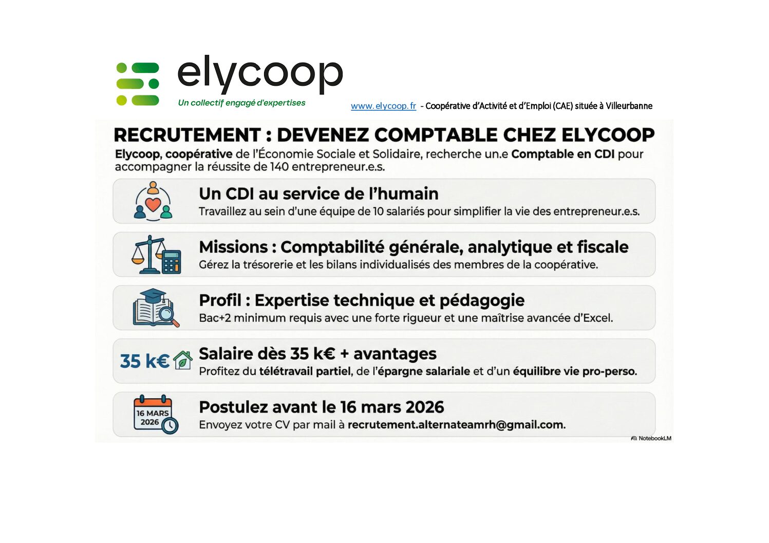 Elycoop, Coopérative d’Activité et d’Emploi (CAE), accompagne 140 entrepreneur.e.s qui développent et pérennisent leur activité en mutualisant moyens, compétences et outils. Notre équipe support de 10 salariés met en œuvre des missions essentielles (hébergement juridique, accompagnement, statut protecteur, appui comptable et administratif, réseaux) pour simplifier la vie des entrepreneur.e.s et favoriser leur réussite. Notre modèle coopératif s’ancre dans les valeurs de l’Économie Sociale et Solidaire : coopération, solidarité et innovation sont au cœur de notre action. Plus d’infos : www.elycoop.fr